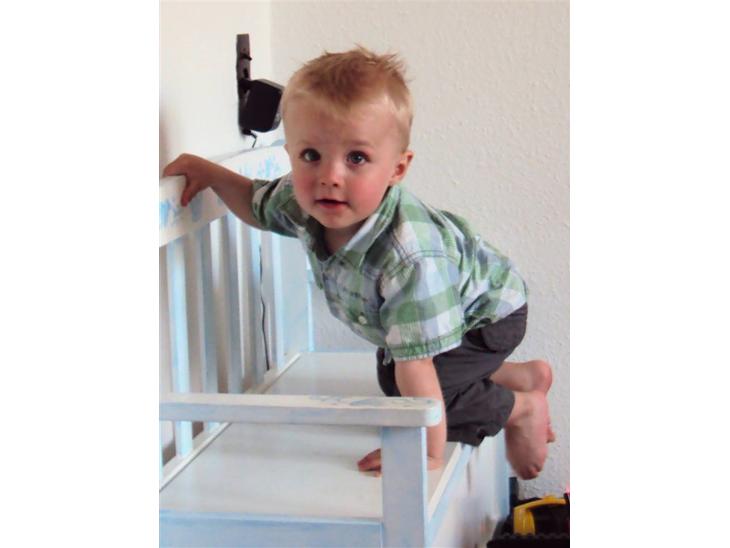Frederic elsker sin legebænk... Han kan få maget tid til at gå ved at tømme og putte nye ting i den - kravle op på den og hoppe ned igen - kravle ned i den mm.